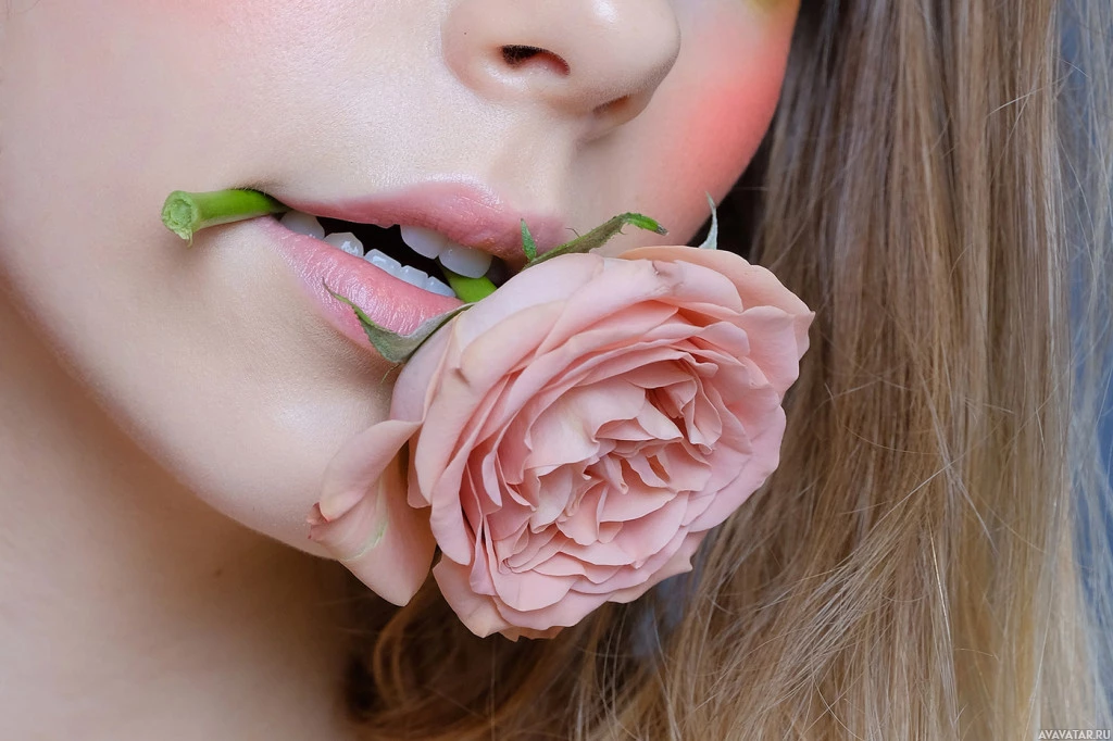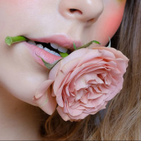 a pink flower. The flower appears to be a rose or a similar type of petal. The person's face is not clearly visible due to the angle and framing of the image, which focuses on the flower near their mouth.