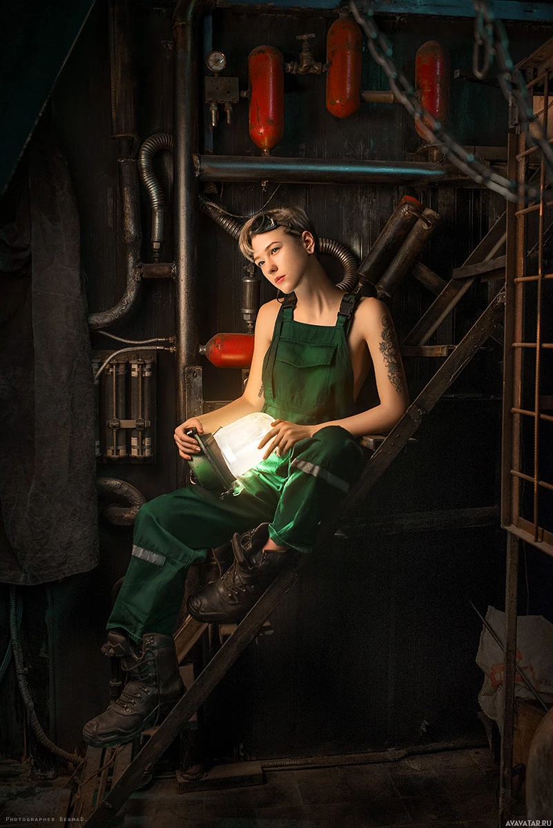 a warm light, contrasting with the cooler tones of the industrial environment around her. The woman is looking away from the viewer, engrossed in her work or perhaps lost in thought. The surroundings include various pipes and machinery, indicating that this might be a place where