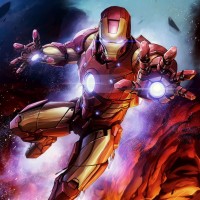 full armor, engaged in combat with energy blasts visible around him, suggesting action or an intense battle scenario. Iron Man's character is known for his suit, which has advanced technology that allows him to fly and fire