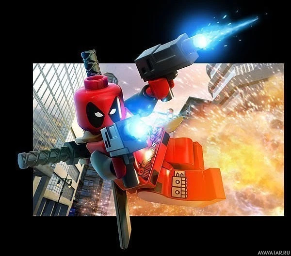 an animated character resembling Deadpool, a popular comic book character, who is known for his sarcastic sense of humor and mercenary nature. This particular version appears to be styled after the Lego brand, given its blocky form and