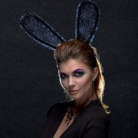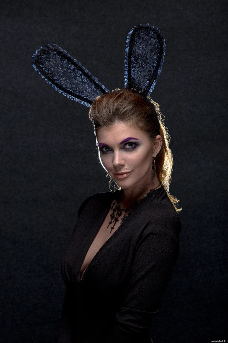 a black top, and she is looking directly at the camera with a neutral expression. The background is dark, which contrasts with her outfit and highlights her features.