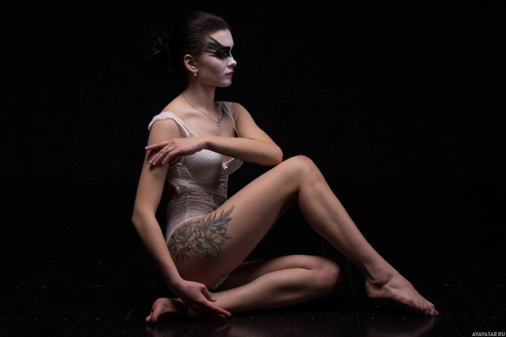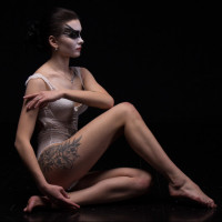 a sheer garment and has tattoos visible on her skin. Her makeup appears to be dramatic, featuring dark eyeliner and