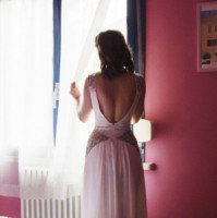 The image shows a woman standing in a bedroom. She is wearing a dress and appears to be looking out of