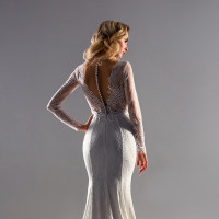 The image features a woman standing in profile. She has blonde hair and is wearing a wedding dress with long sleeves and a high back, which suggests an elegant design. The background is plain, highlighting the details of the dress.
