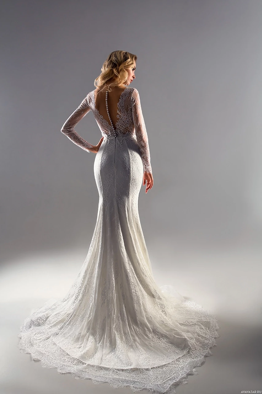На картинке изображена женщина, стоящая в профиль. Она имеет светлые волосы и носит свадебное платье с длинными рукавами и высокой спиной, что предполагает элегантный дизайн. Фон прост, выделяя детали платья.