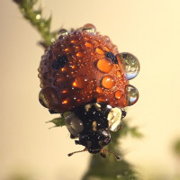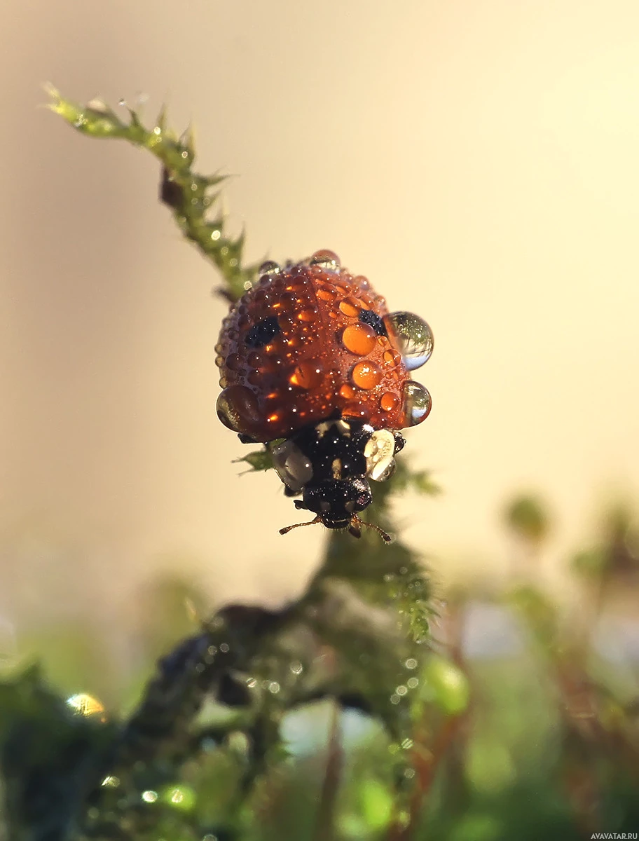 На картинке изображен божья коровка, сидящая на том, что кажется растением, покрытым каплями воды. У божьей коровки закрыты крылья и она обращена в сторону от камеры, давая представление о своем теле. Его цвет представляет собой смесь оранжевого и черного, что характерно для многих видов божьих коровок.