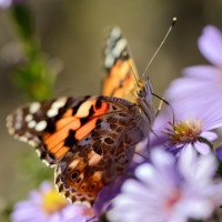 The image shows a butterfly perched on a purple flower, which appears to be a type of wildflower commonly found in gardens and meadows. It seems like the butterfly is enjoying the nectar from the flowers. The butterfly's wings are visible with their distinct colors, including shades of orange, brown, and white.