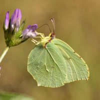 The picture features a vibrant butterfly perched on what appears to be a flower. The butterfly has wings that are primarily yellow with greenish-brown spots, and it seems to be resting or feeding from the plant. There is also a small purple flower nearby. It's a beautiful example of wildlife interacting with flora in nature.