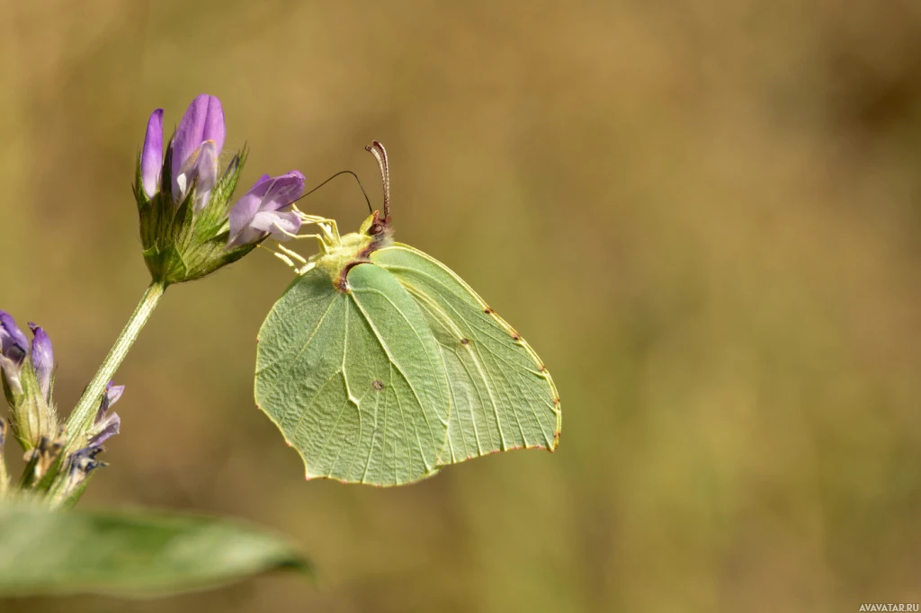 На картине изображена яркая бабочка, сидящая на том, что кажется цветком. У бабочки есть крылья, которые в основном желтые с зеленовато-коричневыми пятнами, и она, кажется, отдыхает или питается от растения. Рядом также есть небольшой фиолетовый цветок. Это прекрасный пример взаимодействия дикой природы с флорой в природе.