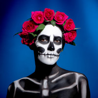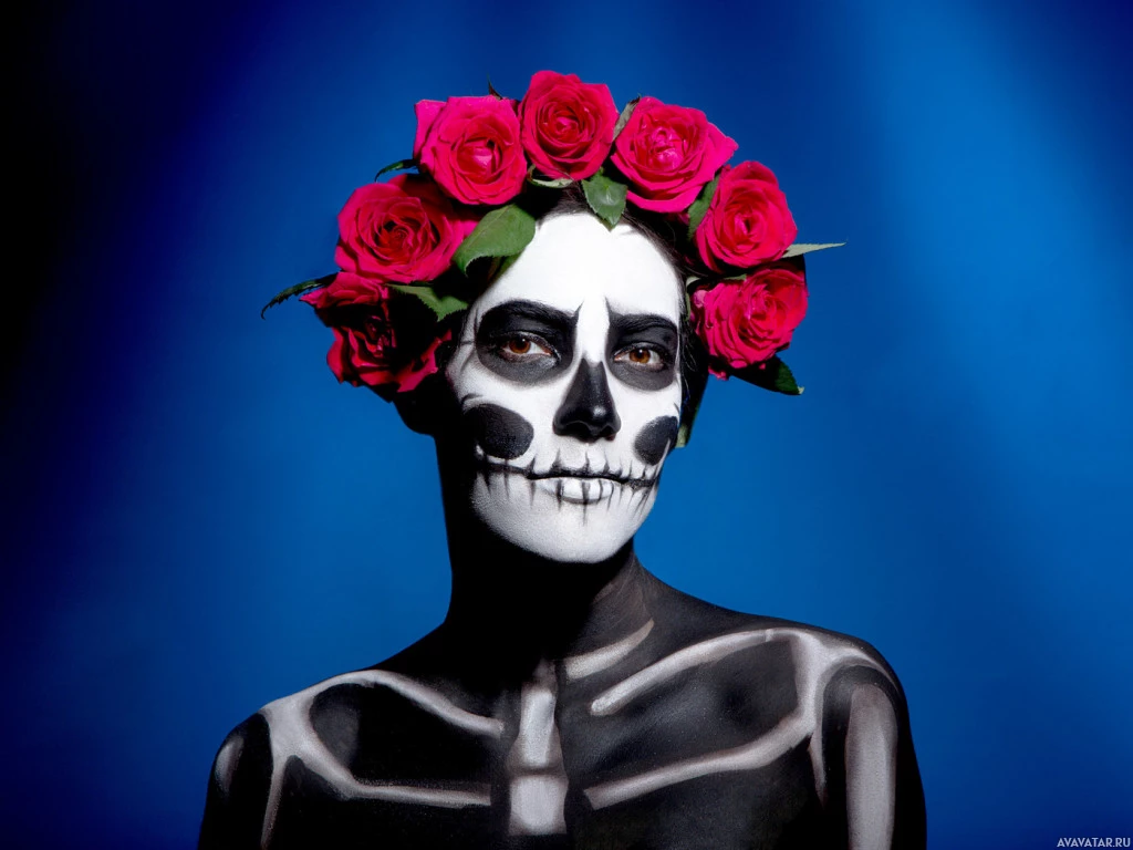 The picture features a person dressed in traditional Day of the Dead (Día de Muertos)