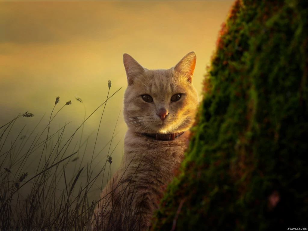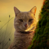 tabby cats and seems to be looking directly at the camera, giving it a curious or attentive expression. The lighting suggests either sunrise or sunset, with warm colors in the sky that create