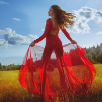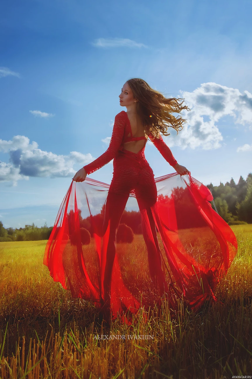 flowing fabric around her hands and appears to have a sheer upper section. Her hair is blowing slightly, indicating a breeze, and there are clouds visible in the sky above. The setting seems peaceful with
