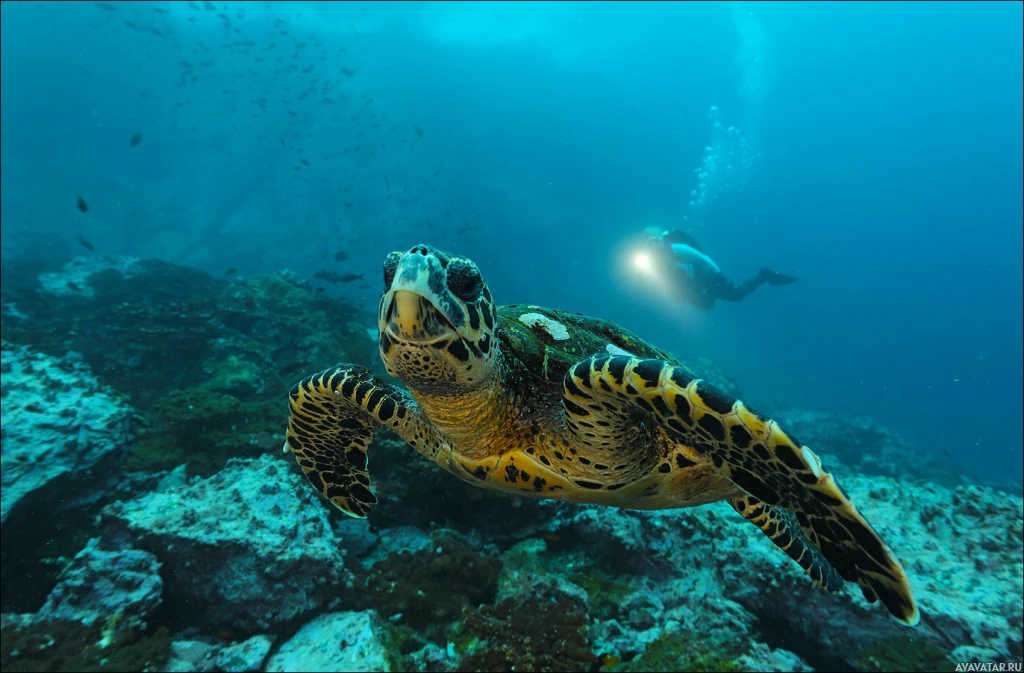 На снимке изображена плавающая под водой морская черепаха. По-видимому, черепаха находится в районе с видимыми коралловыми рифами и другими морскими обитателями, что говорит о том, что она является частью здоровой экосистемы океана.