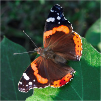 body of the butterfly is dark brown or black, and it has antennae that are typical for this type of insect. It appears to be resting on a leaf, which suggests