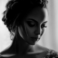 a special occasion such as a wedding or formal event. The lighting in the photo creates a soft and warm glow around her face and shoulders, highlighting her features without casting