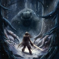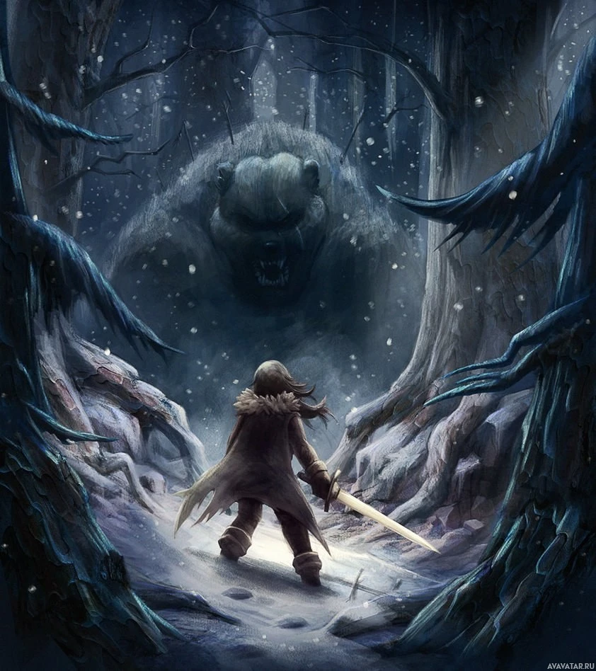The image depicts a character who appears to be a girl facing a large, menacing bear in a forested area during what seems like twilight or nighttime given