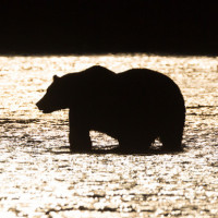 a silhouette of an animal, which is identified as a bear. It appears to be at nighttime or during sunset, given the golden light reflecting on