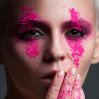 short hair and appear to be wearing makeup, including eyeshadow and pink glitter or powder on their face, which is smeared around their mouth area. The background of the image is plain and does not provide any significant details about the location.