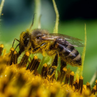 a natural setting, possibly a garden or a field during springtime. Bees are known to visit flowers for pollen and nectar, so it's common to find them on flowers such as dandelions. The bee is engaged in its