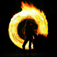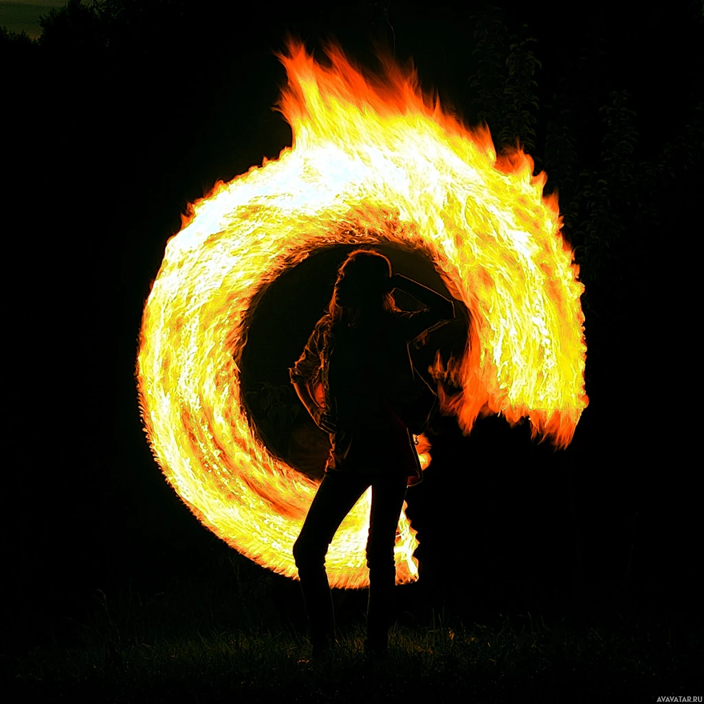 На картинке изображен силуэт человека, стоящего перед большим круглым пламенем. Это может быть воспринято как «глаз» из-за формы, но это действительно круг, созданный огнем. Человек, по-видимому, занимается такой деятельностью, как танец огня или создание художественного представления с огнем, которое обычно делается ночью для драматического эффекта и для освещения свечения пламени на темном фоне.