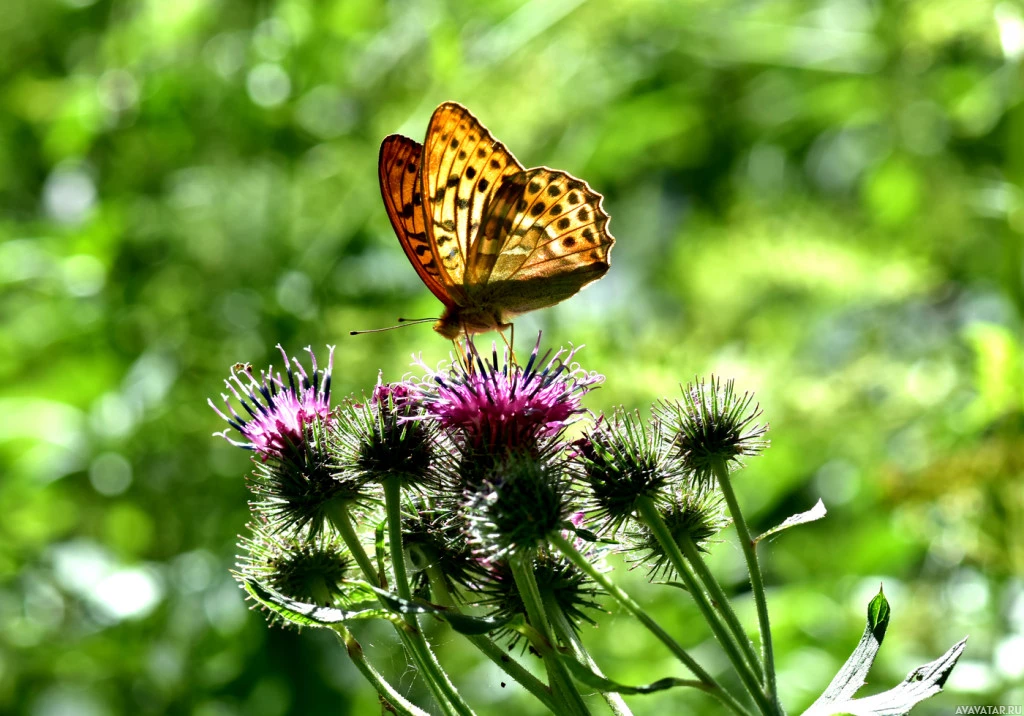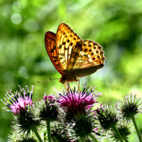 many species in the family Nymphalidae. The setting seems to be outdoors during daylight, and the focus is on capturing the close-up interaction between the butterfly and its environment.