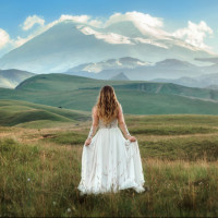an open field with mountains visible in the distance. She is wearing a long,