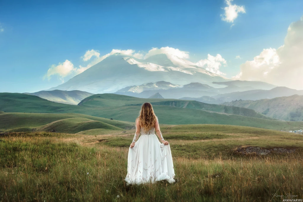 white dress and has her back to the camera. The sky is clear, suggesting it might be early morning or late afternoon given