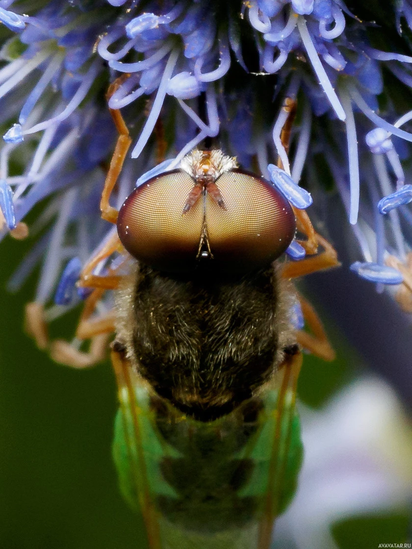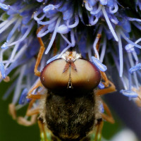 The image features a close-up of an insect, which appears to be a large moth or butterfly due to its size and the pattern on its wings. It is clinging to what looks like a cluster of flowers, possibly for feeding purposes. The background is blurred, emphasizing the focus on the insect itself.