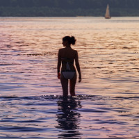 body of water during either sunrise or sunset, given the warm hues and the soft lighting. The individual is facing away from the camera, looking towards the horizon, which adds an air of solitude and contemplation to the scene. The reflection of the person and their surroundings on the water surface creates