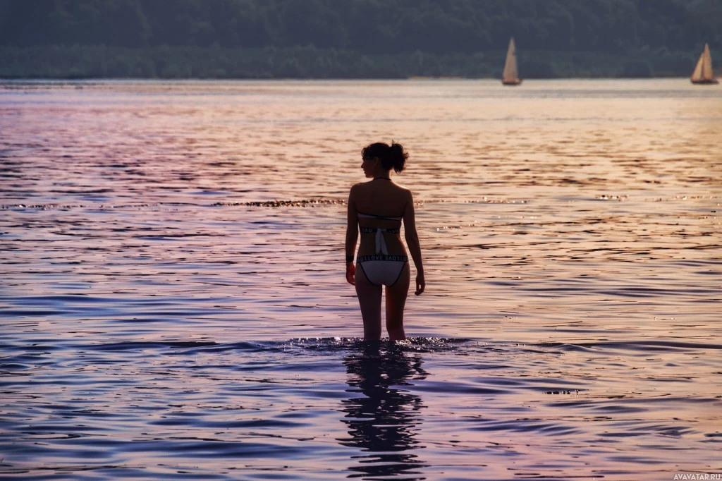 The image features a person standing in shallow water near the shore of what appears to be a lake or calm
