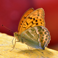 a yellow surface. The butterfly has distinctive orange and black wing patterns, which is characteristic of