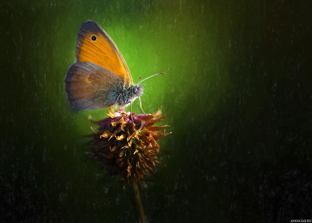 Картинка показывает бабочку, сидящую на цветке. Фон размыт, что акцентирует внимание на бабочке и цветке. Это, по-видимому, насекомое с крыльями, которые, вероятно, окрашены в желтые или оранжевые оттенки, а также антенны. Общее настроение изображения предполагает мирный момент, запечатленный в природе.