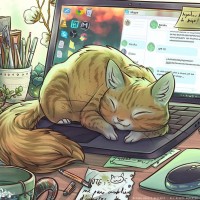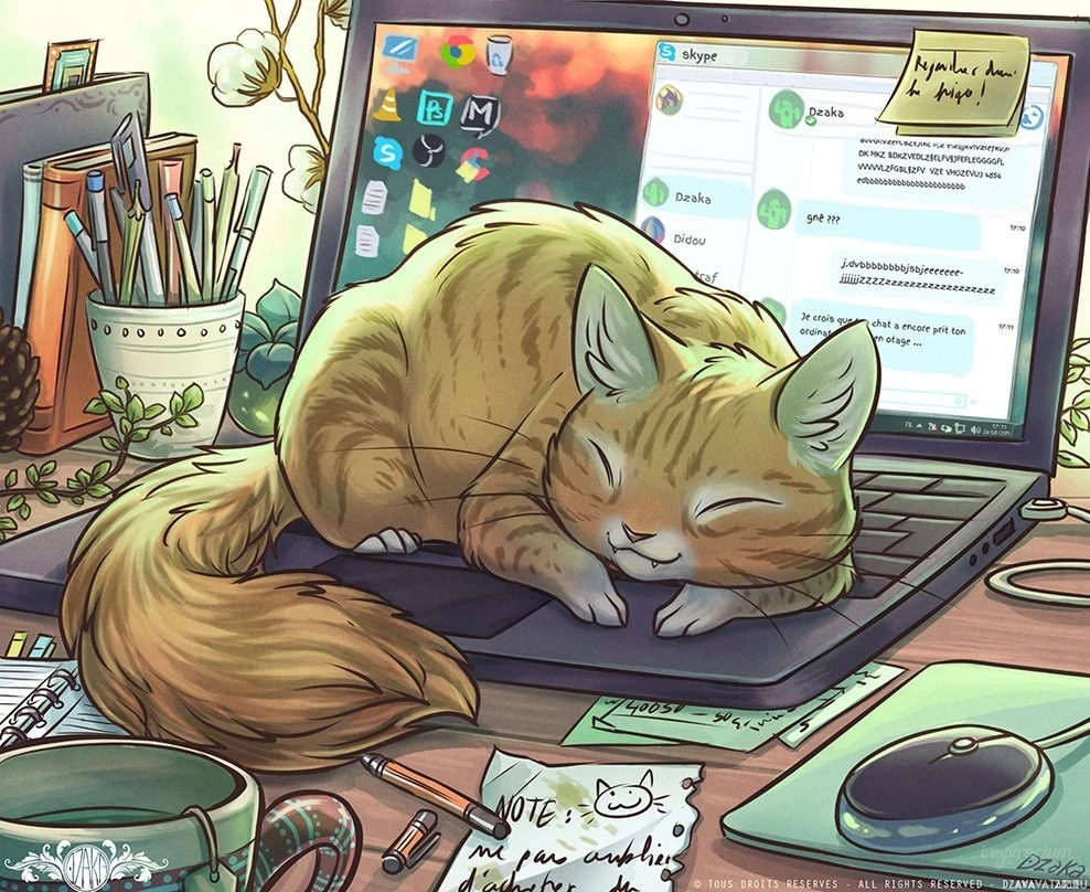 chat window open at the bottom of the screen, indicating that someone might have been communicating with another person through the laptop. The cat appears to be sleeping or resting in
