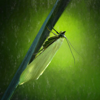 The image shows a bright green-lit background with a single insect, specifically an emerging butterfly or moth caterpillar, resting on what appears to be the edge of