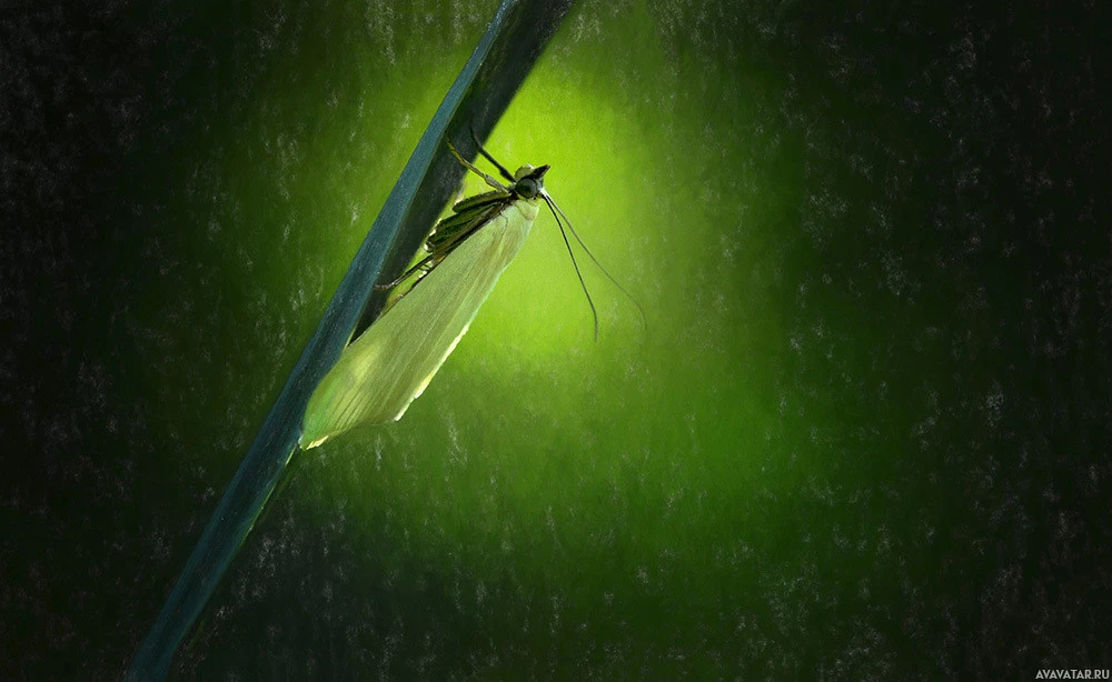 eerie vibe due to the dark and moody lighting that highlights the insect's silhouette against the glowing background.