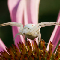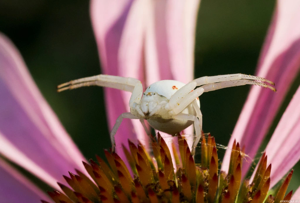 На снимке изображено небольшое животное с восемью ногами, которое широко известно как паук. Этот паук имеет белое тело с красной маркировкой и, кажется, стоит на краю цветка, возможно, одуванчика, учитывая его пушистую головку семени.