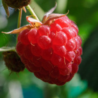 The image shows a bunch of ripe red raspberries. They are still attached to the plant and appear freshly picked, with their bright color indicating they are ripe and ready for consumption.