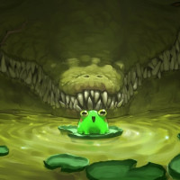 a sense of danger for the frog as it is positioned directly in front of the crocodile's mouth, which could imply that the crocodile is about to catch or eat the frog.