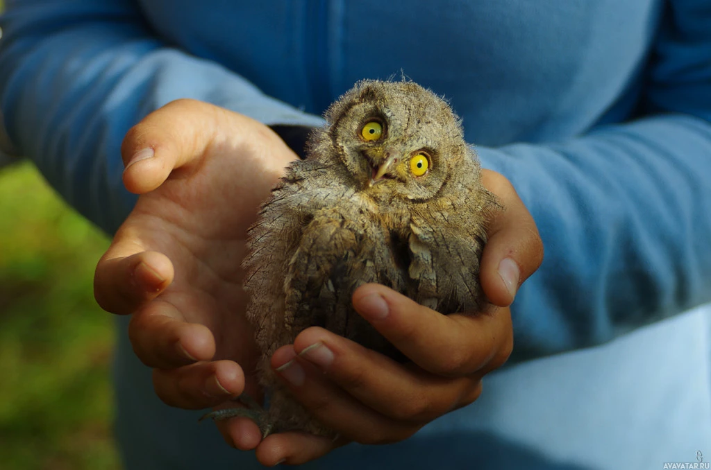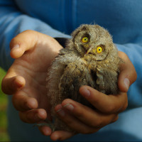 The picture shows a person holding an owl in their hands. The owl appears to be young, possibly just fledged, given its small size and