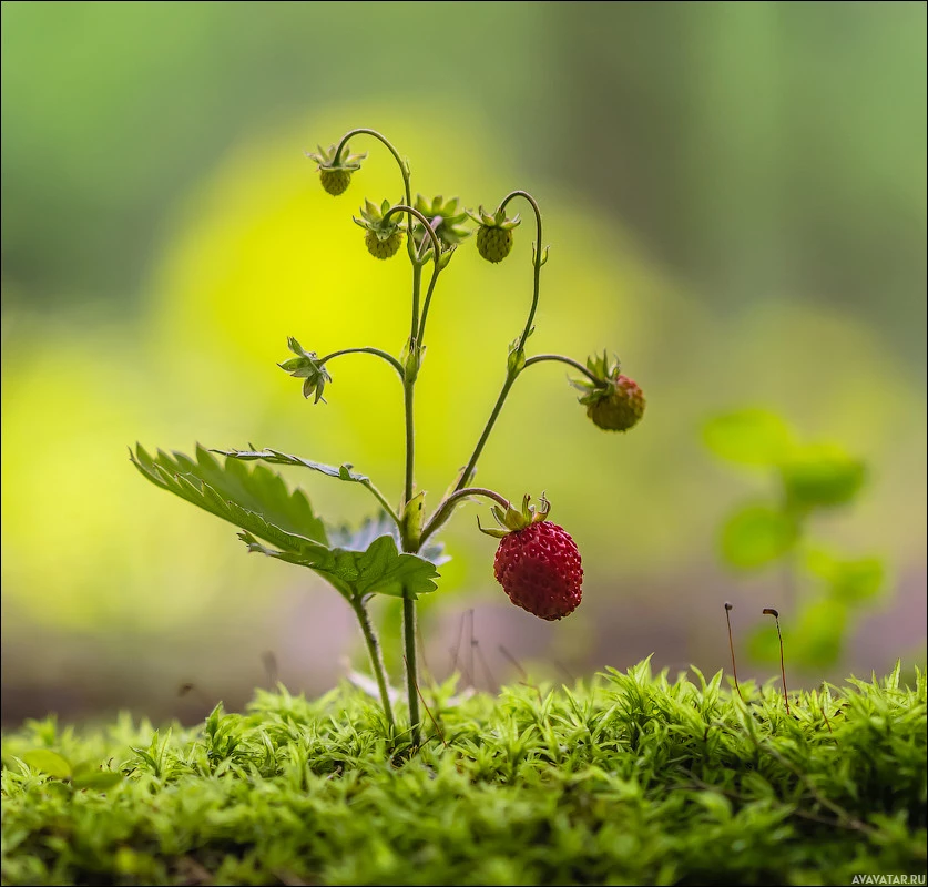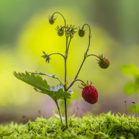a mossy area with other plants and flowers around it. This is an example of the wild type of strawberries, which are often smaller than cultivated varieties and have a more pronounced aroma. It appears to be