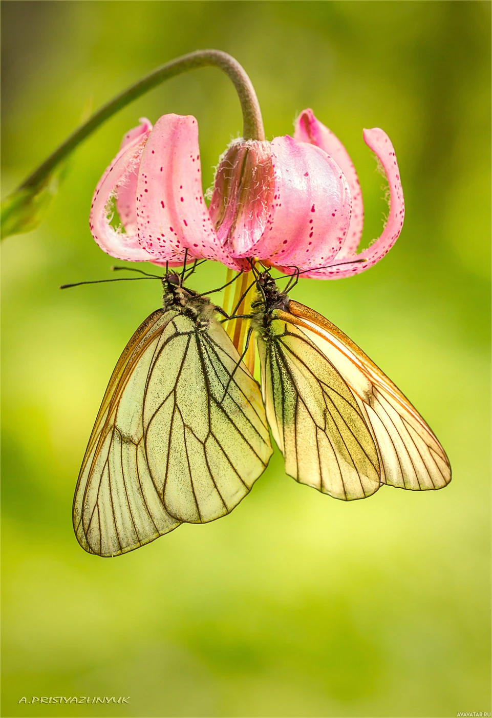 Картинка показывает крупный план двух желтых бабочек, сидящих на лепестках розового цветка. Фон выглядит как естественная обстановка, возможно, сад или лесистая местность.
