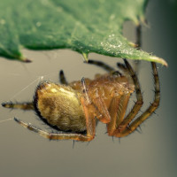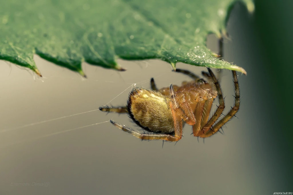На снимке изображен паук, сидящий на чем-то, напоминающем нижнюю сторону зеленого листа. Тело паука частично скрыто краем листа, и кажется, что он отдыхает или поджидает добычу.