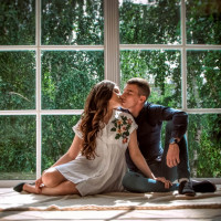 a white dress that has some floral detail on the bodice. Both individuals seem to be dressed formally, which could imply