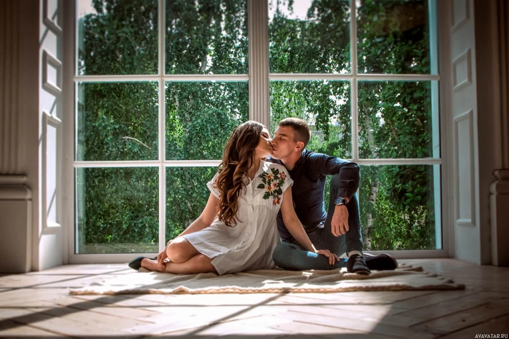 an indoor setting. The man is on one knee, leaning over the woman who is seated with her legs crossed at the ankles. They are looking at each other closely, and it appears as though they might be sharing a romantic moment or possibly celebrating