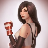 an illustrated character who appears to be a female with brown hair, wearing a white tank top and red gloves. She has
