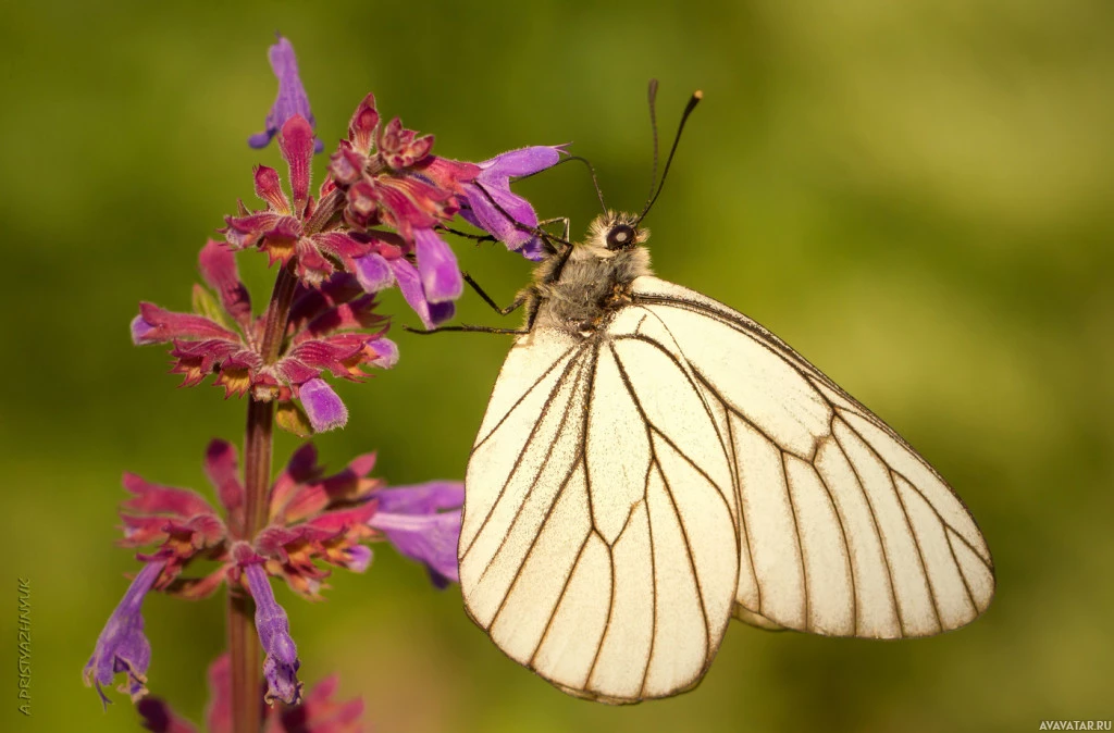 На картинке изображена бабочка, сидящая на некоторых растениях, вероятно, цветах. Это насекомое с крыльями, которые преимущественно белые с черными пятнами. Растение, на котором он покоится, кажется лавандовым или фиолетовым по цвету.