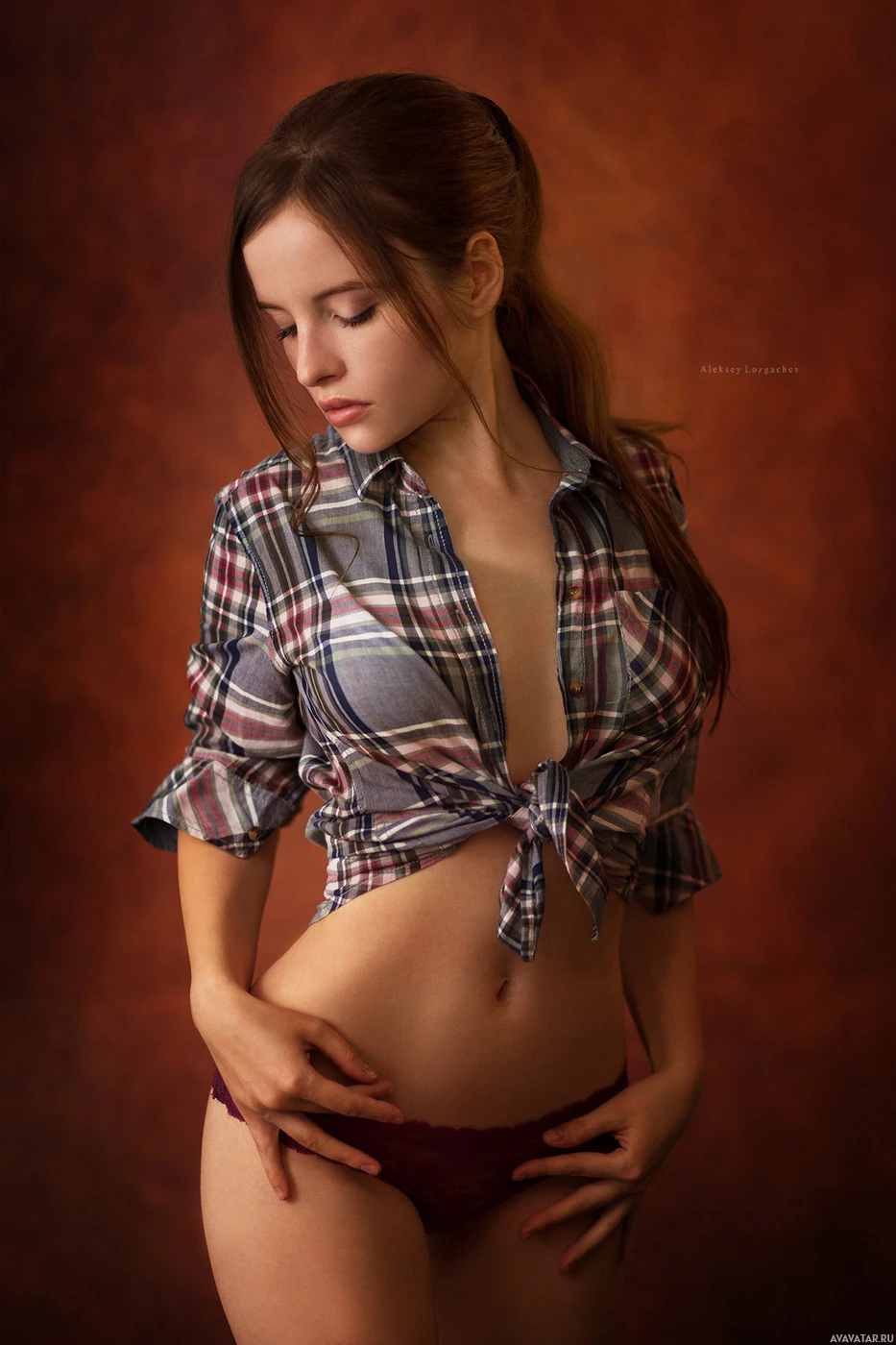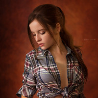 The image shows a woman posing in a studio setting. She is wearing a denim shirt with the sleeves rolled up, and her eyes are closed while she appears to be looking down towards her hands. Her expression seems relaxed and contemplative.