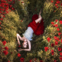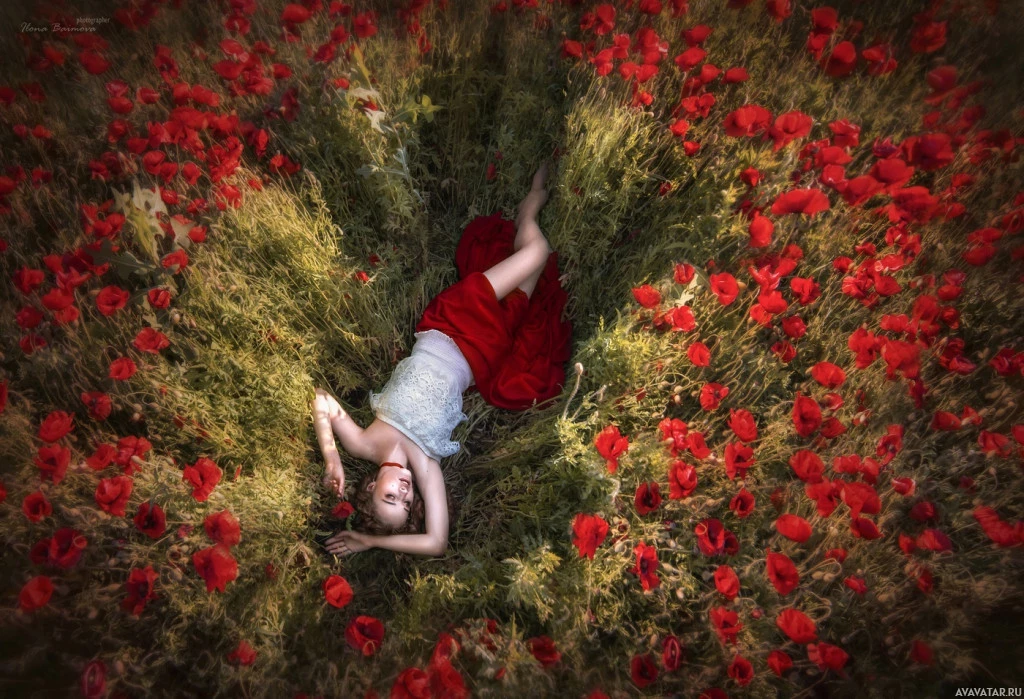 red poppies. The person appears to be relaxed and comfortable, with their head resting on one hand and the other arm extended outward. They are dressed in what seems to be white or light-colored clothing, contrasting with