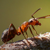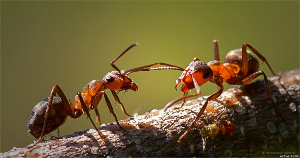 На снимке изображены два муравья на ветке дерева. Они обращены друг к другу, и один муравей, кажется, кусает антенны другого муравья. Такое поведение можно интерпретировать как форму агрессии или общения между насекомыми.