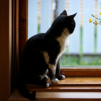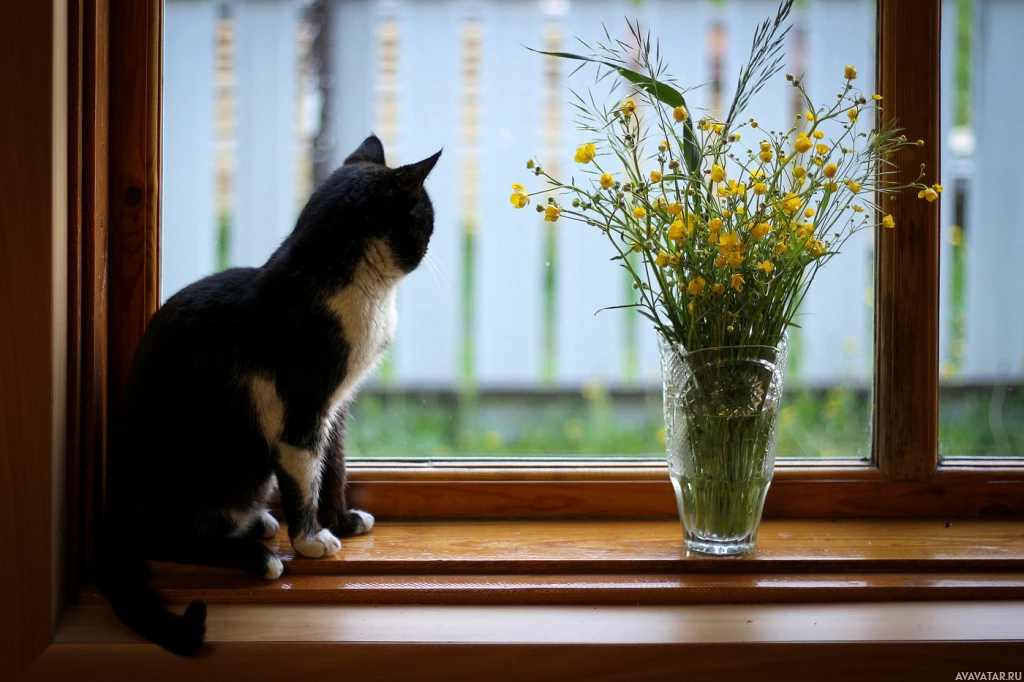 yellow flowers in a vase placed next to the cat on the windowsill, and outside the window, it appears to be daylight with some greenery visible. The picture also contains a text that says "cat sitting by window."